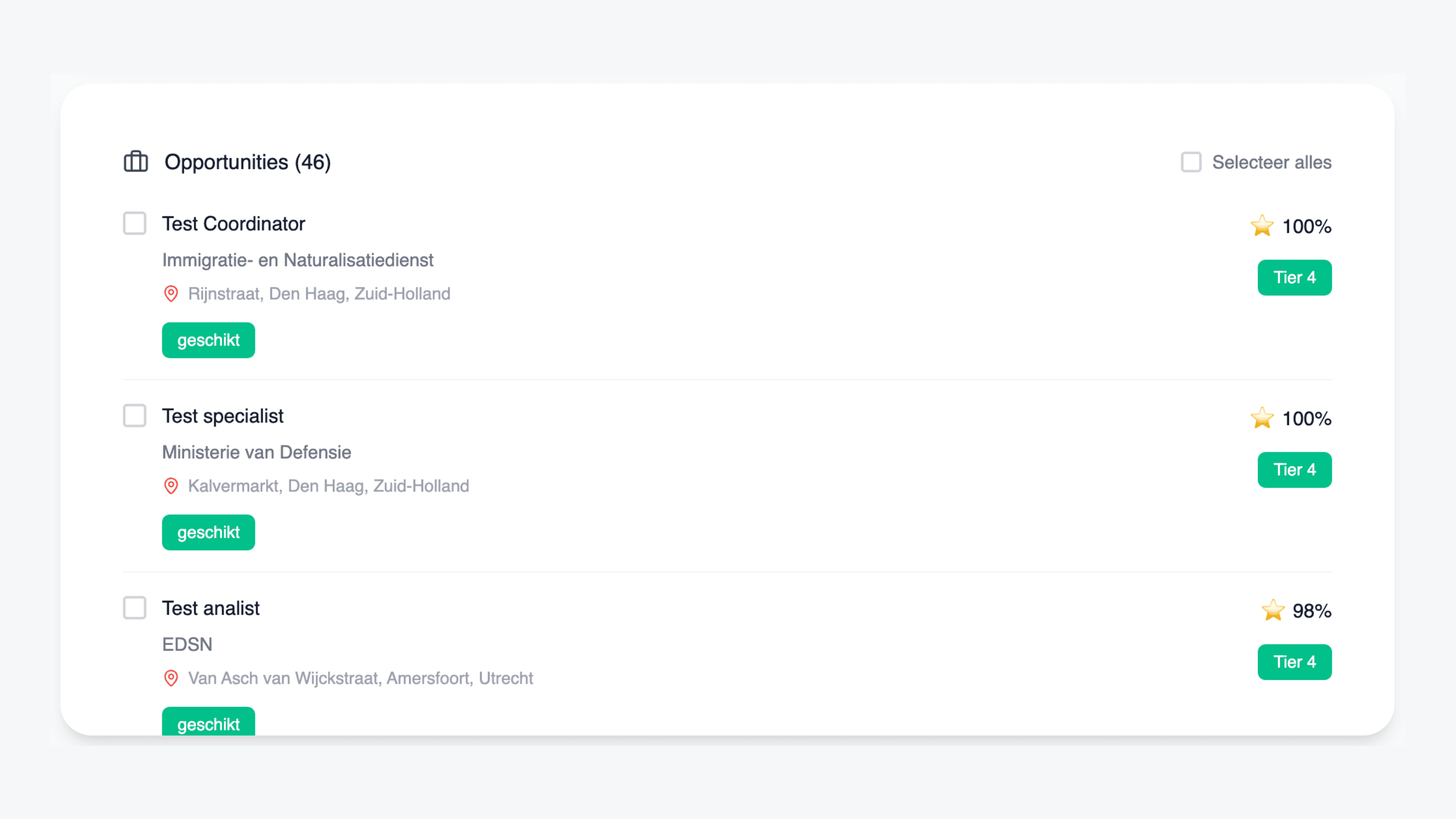 Ontvang alle kansen inclusief match score binnen de gewenste reisafstand.
